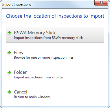 - RSWA Memory Stick: Import inspections from RSWA synchronization memory stick.