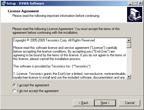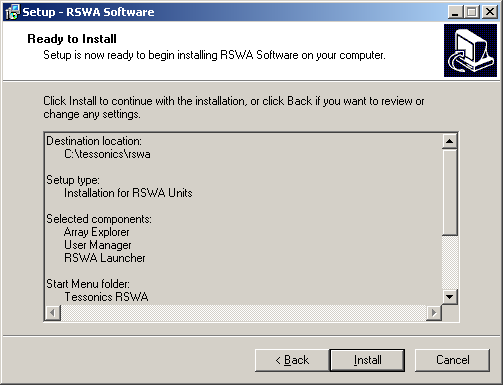 Choose the directory where RSWA files will be installed. It is recommended to keep the default path C:\tessonics\rswa.