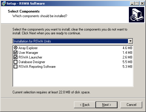 - If installing the software on an RSWA unit, choose Installation for RSWA Units.